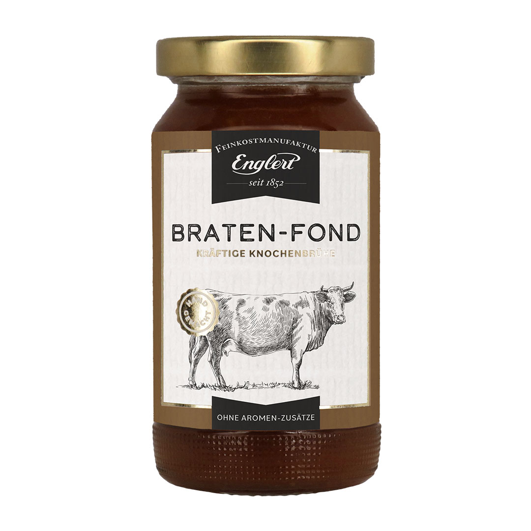 Der Braten-Fond eignet sich zur Zubereitung von Gerichten, Gemüsepfannen, Aufläufen und als Basis für Suppen und Saucen. Verwendungstip Bratensauce: Kleingehackte Zwiebeln in Butter glacieren. Mit Rotwein ablöschen, frische Petersilie und Kräutersträußchen hinzufügen und Fond aufgießen. Erhitzen, durch Sieb passieren und Mehlbutter (Roux) mit Schneebesen bis zur Bindung unterschlagen. Leicht zerdrückte grüne Pfefferkörner, etwas Sherry hinzufügen und Sahne unterziehen, Schmeckt besonders zu kurzgebratenem Fleisch.